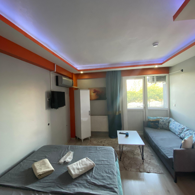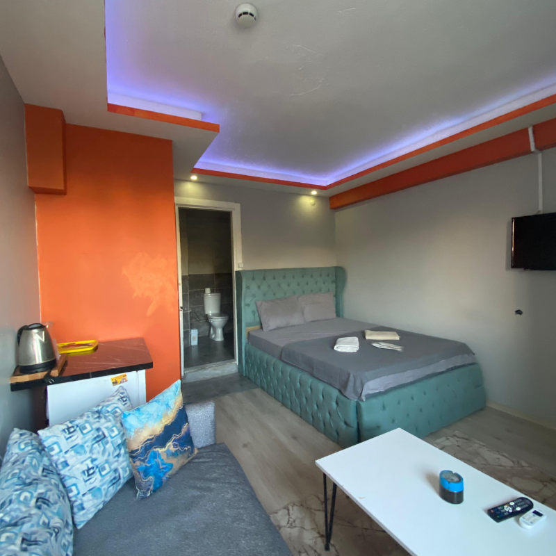 Oda 2, İzabel Rezidans’ın sunduğu ferah ve geniş yaşam alanlarıyla özellikle uzun süreli konaklama planlayan misafirlerimiz için tasarlanmıştır. Balkonlu yapısı, gün ışığını bolca alan mimarisi ve fonksiyonel düzeni sayesinde ev konforunu aratmayan bir atmosfer sunar. Hem bireysel hem de çift konaklamaları için uygun olan bu odada; geniş çift kişilik yatak, mini mutfak, çalışma masası ve konforlu bir oturma alanı mevcuttur.